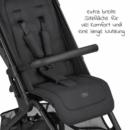Das Design des Ping Two im Farbton Ink vereint intelligente Funktionen mit modernem Stil und zeitlosem Chic. Ob das mattschwarze Chromgestell, der exklusive Stoff, edle Lederoptik am Schieber oder am Schutzbügel, oder die optisch eindrucksvollen Weißwand-Reifen – der Ping Two bietet zahlreiche Highlights.