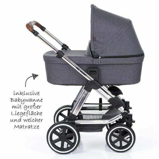 In Kombi-Kinderwagen Condor 4 Air – Diamond Special Edition by ABC Design, you can easily turn through the streets and countryside while your baby is sleeping in the comfortable baby bath with hood and cover. The Condor 4 Air combines the advantages of the proven Condor 4 with the positive properties of air traps. Larger children take a nap in the comfortable lying position of the fully adjustable stroller attachment. Here your little one observes the colourful hustle and bustle in front of him or looks into the familiar faces of the parents. The convertible seat unit makes it possible. Particularly practical: With the new click system, diaper bag, cup holder and more are attached particularly quickly and securely to the height-adjustable slider.
