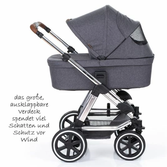 The baby bath is equipped with a breathable mattress, a new, particularly soft interior and a protective cover. So your baby has it warm and comfortable. On hot days, the fold-out hood with UV protection provides plenty of shade for your treasure. Later you can simply replace the baby bath with a sports car seat unit. This can be adjusted and implemented as a whole. So your little one can sleep in lying position, watch the colourful hustle and bustle in front of him or look into the familiar faces of mum and dad. A padded 5-point harness and a protective leather-look bar provide the necessary safety. Practical: When you put your child in, you simply open the Bügel and the little passenger slips into the seat. You can adjust the feet separately and wipe them clean quickly and easily thanks to the rubber coating. You’re allowed to slouch. In sunshine, the large hood with UV protection is used. The Condor 4 Air offers your child a lot, scores with a height-adjustable slider in a cool leather look and a large shopping basket, but also with mum and dad. Especially practical is also the new click system on the slider, with which you can easily and securely attach accessories, such as diaper bags or cup holders.