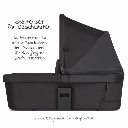 Der Zoom ist einer der flexibelsten Geschwisterwagen. In der Grundausstattung wird der Zoom mit 2 Sportwagenaufsätzen geliefert. Wenn Du ihn ab der Geburt verwenden möchtest, bietet ABC-Design eine passende Babywanne für Neugeborene. Für Zwillinge kannst Du sogar 2 Babywannen gleichzeitig auf dem Gestell montieren. Ebenso besteht die Möglichkeit, eine oder zwei Babyschalen auf dem Gestell zu montieren oder die verschiedenen Aufsätze miteinander zu kombinieren.