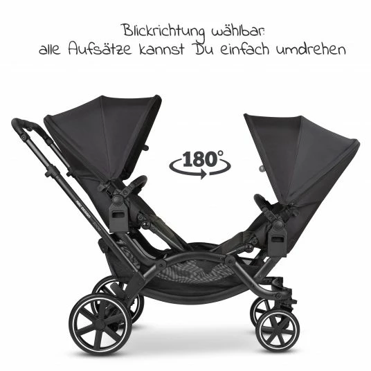 Der Geschwisterwagen Zoom inkl. 2 Sportsitzen – Classic Edition – Ink von ABC Design ist der perfekte Wagen für Zwillinge und Geschwister mit geringem Altersunterschied. Neben einer variablen Blickrichtung gibt es auch verschieden Aufsatz-Möglichkeiten: Beide Plätze kannst Du beliebig mit Sportsitzen, Babyschalen oder Babywannen verwenden. Außerdem punktet der Zoom mit ausklappbaren Verdecken, großen Luftkammerrädern und einem Klick-System für Zubehör am höhenverstellbaren Schieber.