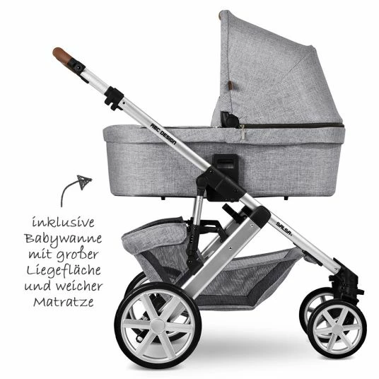 - Ausstattung: Babywanne mit Matratze und großem Sonnenverdeck, Sportwagensitz mit flacher Liegeposition, ausklappbarem Verdeck, gepolstertem 5-Punkt-Gurt, abnehmbarem Schutzbügel, kugelgelagerte und pannensichere Luftkammerräder, zentrale Federung, höhenverstellbarer Schieber