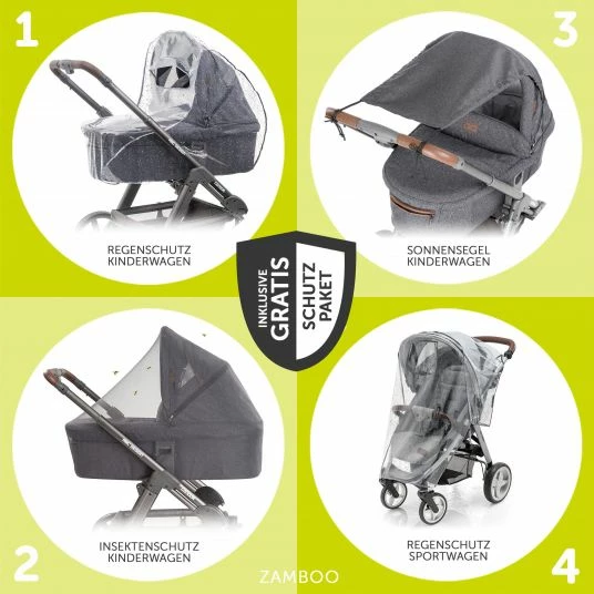 MIT GRATIS XXL ZUBEHÖRSET VON ZAMBOO: Beim Kauf dieses Kinderwagen-Sets schenken wir Dir eines unserer beliebten XXL Zubehörsets. Das Set beinhaltet alles was Du brauchst – Regenschutz für Babywanne und Sportwagen, ein universell nutzbares Insektennetz sowie ein großes Sonnensegel.