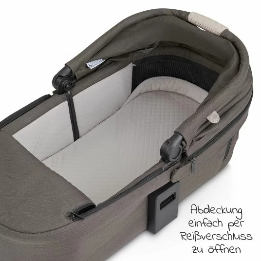 Die Babywanne ist mit einer hochwertigen, besonders weichen Matratze mit erhöhtem Rand ausgestattet und bettet Dein Neugeborenes sehr bequem. Geschützt wird es von der passenden Wannenabdeckung und einem großen Verdeck. Das Verdeck ist mit einem UV-Schutz 50+ ausgestattet. Für warme Tage ist jeweils ein Belüftungsfenster am Verdeck und eines am Kopfende der Wanne integriert.