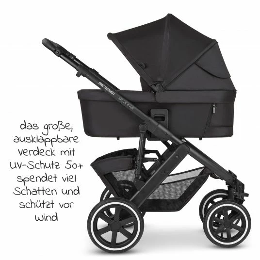 - Besonderheiten: faltbare Babywanne mit zwei großen Lüftungsfenstern, extra weiche, keilförmige Babywannen-Matratze mit erhöhtem Schutzrand, sehr geräumiger Einkaufskorb, Blickrichtung wählbar, Schieber-Griff & Schutzbügel in Lederoptik, viel Beinfreiheit beim Schieben, kompakt faltbar