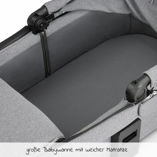 Die Babywanne ist mit einer besonders weichen Matratze ausgestattet und bettet Dein Neugeborenes sehr bequem. Geschรผtzt wird es von der passenden Wannenabdeckung und einem groรen Verdeck. Das Verdeck ist mit einem UV-Schutz 50+ ausgestattet. Fรผr warme Tage ist ein Belรผftungsfenster am Verdeck integriert.