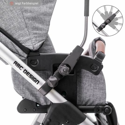 Für die Montage hast du zwei Möglichkeiten. Wenn Du einen aktuellen Kinderwagen oder Buggy von ABC-Design Dein Eigen nennst, kannst Du die praktische Klickbefestigung verwenden. Hierzu klickst Du die Halterung einfach auf den Befestigungspunkt am Gestell. Alternativ kannst du auch die klassische Universal-Klemme verwenden. Hierbei kannst Du den Schirm an jedes beliebige Rohr des Kinderwagen-Gestells klemmen. Dies ist an runden und ovalen Rohren möglich.