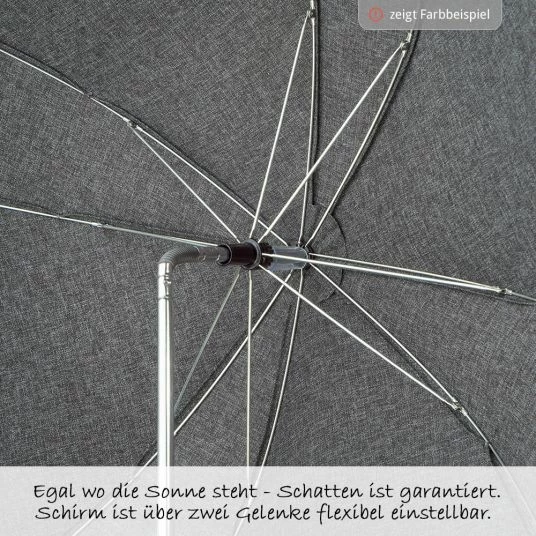 Für Babys sensible Haut bietet der Schirm einen idealen Schutz vor gefährlicher UV-Strahlung. Dank UV-Schutz 50% blockt er zuverlässig 98% der Strahlung ab. Der Durchmesser von ca. 60 cm bietet ausreichend Schatten. Je nach Sonnenstand kannst Du den Sonnenschirm über zwei Knickgelenke individuell verstellen.