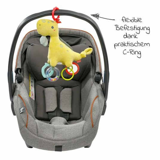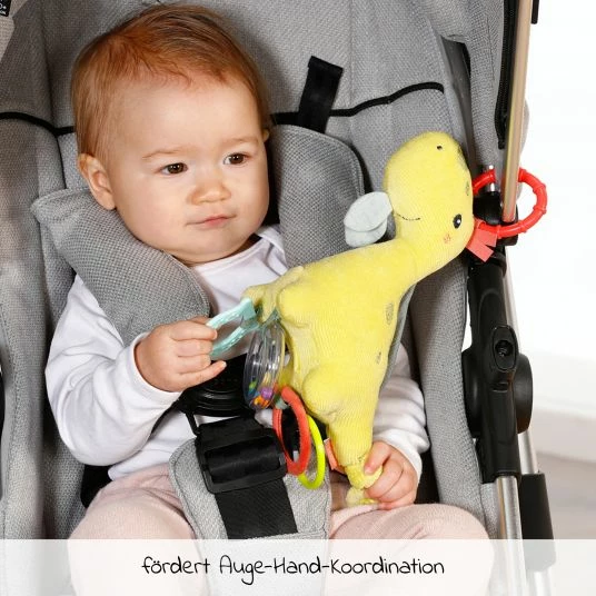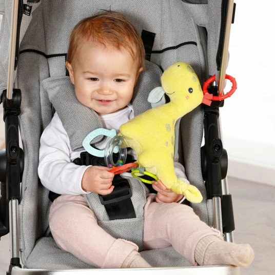 Dank des praktischen C-Rings kann der Activity-Dino überall dort befestigt werden, wo er gerade benötigt wird. So kann Dein Baby seinen Spielgefährten auch unterwegs mit dabei haben, im Kinderwagen oder in der Babyschale. Die fröhliche Gestaltung macht das Spielzeug zu einer tollen Geschenkidee.