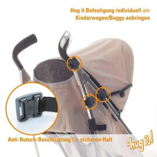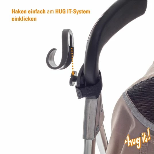 Mit Hilfe des 2er Packs Befestigungshaken HUG IT! für Kinderwagen von Diago hängen Einkäufe und Co ruckzuck am Kinderwagen. Das clevere System besteht aus 2 Befestigungselementen aus Klett, die Du ganz einfach an der Schiebestange bzw. an den Schiebegriffen Deines Kinderwagen befestigst. Anschließend werden die beiden stabilen Haken eingeklickt.