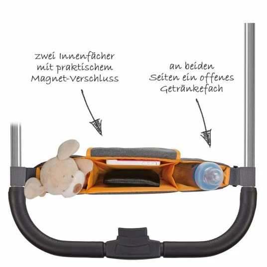 The Strollers organizer in grey/orange from Diago offers you additional storage space for various important things that you like to have handy when walking. Two open side compartments are ideal for baby bottles or other beverage containers. Two lockable compartments in the middle offer space for cell phone, purse, keys, handkerchiefs etc. The hidden magnet in the closure flap makes it easy to open and close the bag with just one hand.