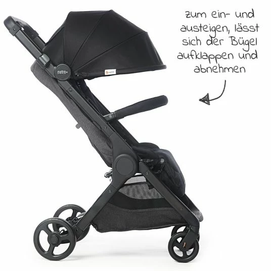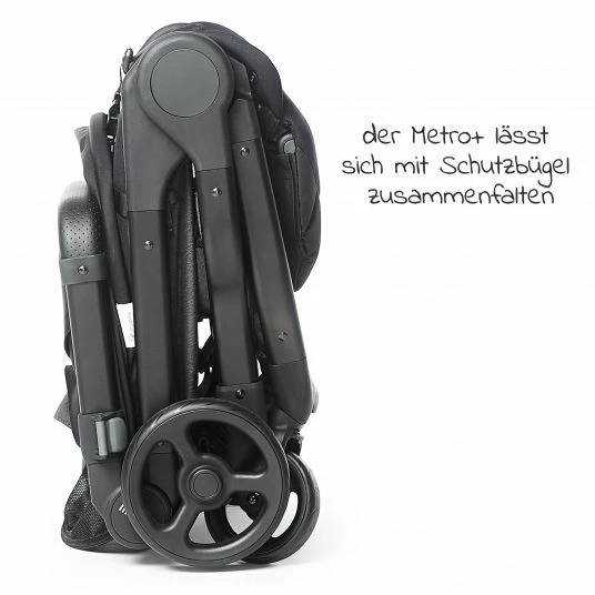 Über einen Klickmechanismus lässt sich der gepolsterte Frontbügel schnell und einfach befestigen. Der Bügel lässt sich so schwenken, dass Dein Kind leichter aus- und einsteigen kann. Auch mit angebrachtem Bügel lässt sich der Metro+ auf ein praktisches Faltmaß zusammenklappen.