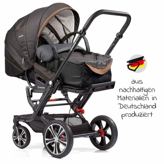 Du möchtest flexibel mit Kinderwagen unterwegs sein und Dein Kind von Anfang an sicher und bequem transportieren? Egal ob Du in der Stadt oder auf dem Land wohnst – mit dem 2in1 Kombi-Kinderwagen F6 Air + Classic mit C1 Lift Tragetasche von Gesslein in Schwarz-Schokobraun seid ihr jederzeit optimal ausgestattet. Mit der Kombination aus Buggy und Tasche bist Du besonders flexibel unterwegs und hast außerdem immer ein praktisches Nestchen für Dein Kleines dabei. Nachhaltigkeit: Die Gesslein Kinderwagen werden in Deutschland genäht und unter fairen Produktionsbedingungen hergestellt. Alle verwendeten Stoffe sind schadstoffgeprüft und entsprechen dem Oeko-Tex® Standard 100.