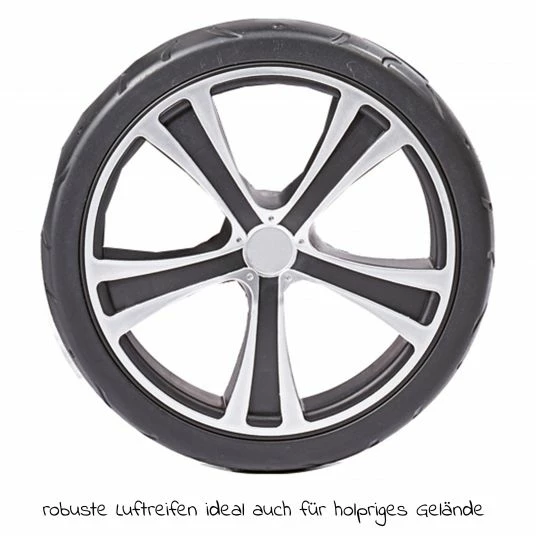 Dank der Air+ Räder, bestehend aus einem Schaumkern mit Luftbläschen und robustem Mantel aus Hartgummi, kannst Du den Kinderwagen auch auf holprigem Gelände fahren. Bei Bedarf lassen sich die Vorderräder feststellen, die Hinterräder sind größer designed und feststehend. Eine Vorderrad-Federung federt Erschütterungen ab und optimiert so das Fahrerlebnis für Dich und Dein Kind. Optional kannst Du die Schwenkräder für besonders stabiles Fahren im Gelände mit einer festen Achse ausstatten. Besonders clever ist der Faltmechanismus: Mit nur wenigen Handgriffen lässt sich das leichte Kinderwagen-Gestell zusammenfalten und in fast jedem Kofferraum verstauen.