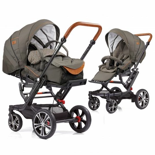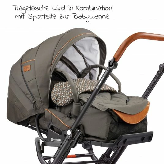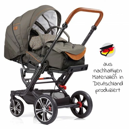 Du möchtest flexibel mit Kinderwagen unterwegs sein und Dein Kind von Anfang an sicher und bequem transportieren? Egal ob Du in der Stadt oder auf dem Land wohnst – mit dem 2in1 Kombi-Kinderwagen F6 Air + Classic mit C1 Lift Tragetasche von Gesslein in Schwarz-Olive seid ihr jederzeit optimal ausgestattet. Mit der Kombination aus Buggy und Tasche bist Du besonders flexibel unterwegs und hast außerdem immer ein praktisches Nestchen für Dein Kleines dabei. Nachhaltigkeit: Die Gesslein Kinderwagen werden in Deutschland genäht und unter fairen Produktionsbedingungen hergestellt. Alle verwendeten Stoffe sind schadstoffgeprüft und entsprechen dem Oeko-Tex® Standard 100.
