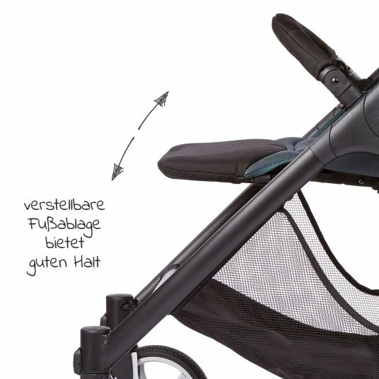 Ein 5-Punkt-Gurtsystem mit Schutzpolster lässt sich individuell an die Größe Deines Kindes anpassen und sichert es in jeder Position. Mit der verstellbaren Rückenlehne kann Dein Schatz im Buggy aufrecht die Welt entdecken oder bequem in Liegeposition schlafen. Für größere Kinder bietet die untere Fußablage guten Halt, für die ganz Kleinen kann die Fußstütze bei Bedarf ausgeklappt werden.