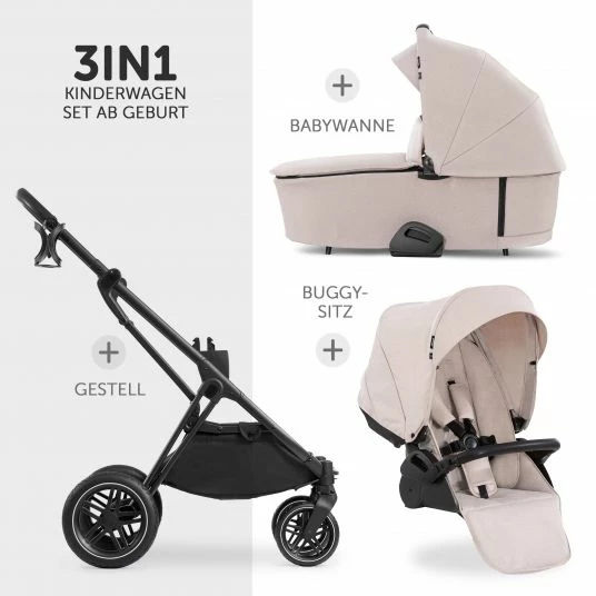 - Ausstattung: Babywanne mit Verdeck und Matratze, umsetzbarer Sportwagenaufsatz mit verstellbarer FuĂstĂŒtze, RĂŒckenlehne mit einer Hand bis in Liegeposition verstellbar, leichtes Alu-Gestell, groĂe und pannensichere All-Terrain RĂ€der, Einkaufskorb, Federung