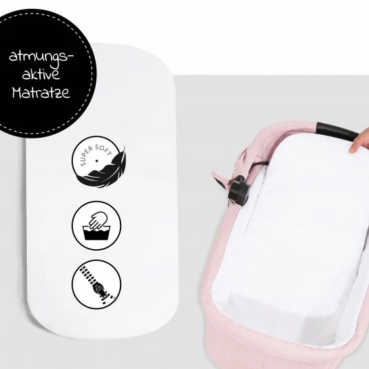 Die kuschelig weiche, atmungsaktive Matratze bietet besonders viel Komfort. Selbst bei längeren Spaziergängen sorgt sie für ein angenehmes Schlafklima. Die Wannenabdeckung bietet zusätzlichen Schutz und lässt sich einfach öffnen oder komplett abnehmen. Später lässt sie sich mit der Sitzauflage des Buggys zu einem kuscheligen Fußsack kombinieren.