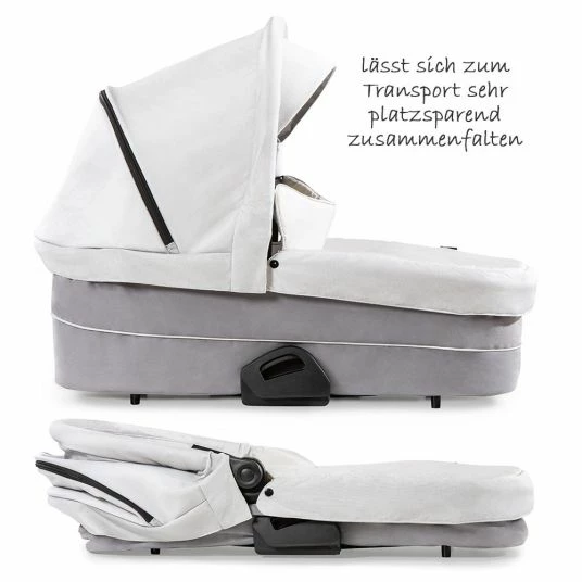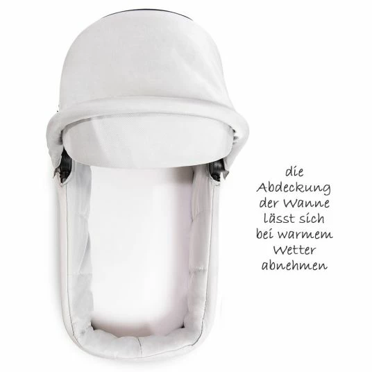 Mit der Babywanne Saturn von Hauck verwandelst Du Deinen Sportwagen in einen kuscheligen Erstlingswagen. Die moderne Babywanne ist mit einem weich gepolsterten Innenleben und einer bequemen Matratze ausgestattet. So liegt Dein Neugeborenes bestens eingebettet. Das große, aufklappbare Verdeck schützt vor Sonne und Wind, die mitgelieferte Abdeckung vor Kälte, Nässe und Zugluft. Du befestigst Sie einfach per Reißverschluss an der Wanne. So bleibt sie auch bei schlechtem Wetter immer an der richtigen Stelle. Für den Transport lässt sich die Babywanne schnell und einfach zusammenfalten. So passt sie z.B. prima ins Auto. Unterwegs kannst Du sie beruhigt abstellen. Kleine Füße sorgen dafür, dass die Wanne stabil steht und der Boden nicht schmutzig wird. Die Wanne kannst Du einfach auf das Apollo-Gestell setzen. Ein Adapter ist nicht nötig.