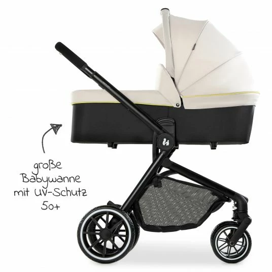 Die Babywanne ist mit einer hochwertigen Matratze ausgestattet und bettet Dein Neugeborenes weich und bequem. Dein Baby genießt in der geräumigen Babywanne mit waschbarem Bezug von Anfang an eine Wohlfühlumgebung in ergonomischer, komplett flacher Liegeposition. Geschützt wird es von der passenden Wannenabdeckung und einem großen Verdeck. Das Verdeck ist mit einem UV-Schutz 50+ ausgestattet. Falls Dir der Wagen beim nächsten Restaurantbesuch zu sperrig ist, nimmst Du die Wanne einfach ab und trägst sie per Hand am stabilen Tragegriff. Wenn Du für den Transport im Auto wenig Platz hast, kannst Du die Wanne einfach zusammenfalten.