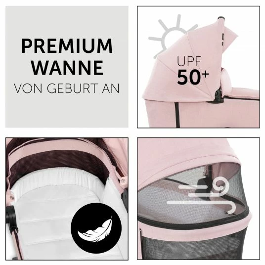 Damit der Nachwuchs bei jedem Wetter geschützt ist, sind sowohl Sportsitz als auch Babywanne mit einem Verdeck mit UV-Schutz 50 + und ausklappbarer Sonnenblende ausgestattet. An wärmeren Tagen können die Decke am Sportsitz, oder die Abdeckung an der Wanne, abgenommen werden. An der Babywanne lassen sich zwei große XXL Panoramafenster und am Sportsitz ein Belüftungsfenster öffnen. Auf diese Weise bleibt die Luft unter dem Verdeck stets angenehm und es kann kein Wärmestau entstehen.