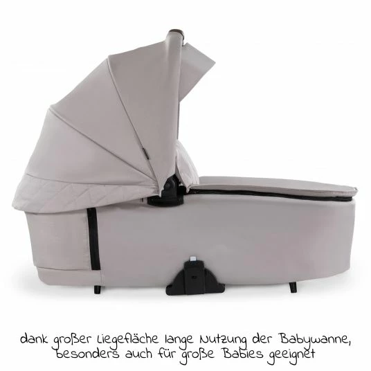 Die Babywanne ist mit einer hochwertigen Matratze samt atmungsaktivem Baumwollbezug ausgestattet und bettet Dein Neugeborenes weich und bequem. Geschützt wird es von der passenden Wannenabdeckung und einem extra großen Verdeck. Unter der Matratze ist der Boden mit Ventilationsöffnungen versehen, damit sich keine Feuchtigkeit sammeln kann. Das Verdeck ist mit einem UV-Schutz 50+ ausgestattet. Dein Baby hat dank der zwei XXL-Panoramafenster frische Luft sowie freie Sicht in Rücken- und Bauchlage. Falls Dir der Wagen beim nächsten Restaurantbesuch zu sperrig ist, nimmst Du die Wanne einfach ab und trägst sie per Hand am stabilen Tragegriff. Wenn Du für den Transport im Auto wenig Platz hast, kannst Du die Wanne einfach zusammenfalten.