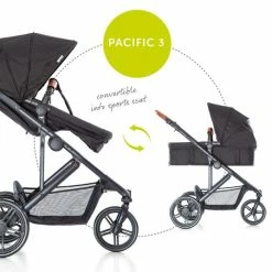 - Ausstattung: Babywanne mit Matratze, Verdeck und Schutzdecke, mit verstellbarer Rückenlehne und Fußstütze (Liegeposition), ausziehbares Verdeck mit Sichtfenster (Netzeinsatz), abnehmbarer und aufklappbarer Schutzbügel, gepolstertes Gurtsystem, Einkaufskorb, höhenverstellbarer Schieber, Federung, schuhschonende One-Touch-Feststellbremse