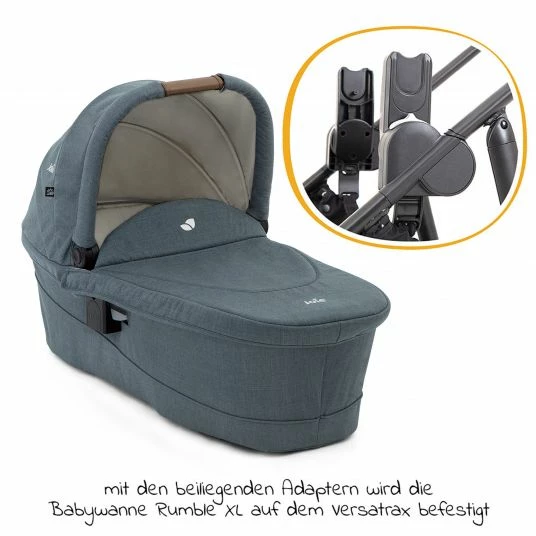Mit der Babywanne Ramble XL kannst Du den Versatrax E bereits ab der Geburt als Erstlingswagen nutzen. Außerdem verwandelt sich der Wagen in Kombination mit der Babyschale Gemm, i-Gemm, i-Gemm 2 i-Size, i-Snug i-Size und den Babyschalen von Maxi-Cosi in ein praktisches Shop‘n-Drive-System. So kannst Du Dein schlafendes Baby samt Schale aus dem Auto heben, auf das Versatrax -Gestell stecken und losgehen – ohne es aufzuwecken. Der benötigte Adapter ist im Lieferumfang enthalten. Die Babywanne und Babyschale lassen sich mit dem Adapter direkt auf dem Gestell befestigen.