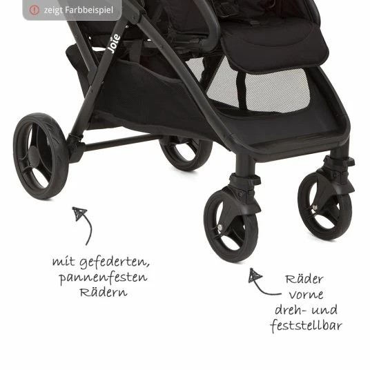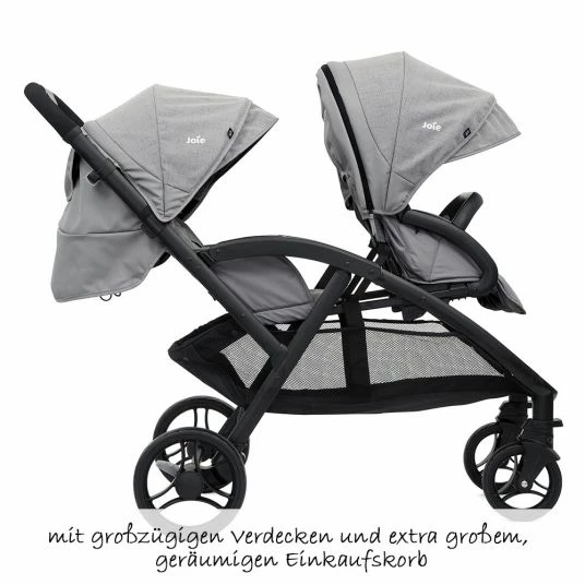 Die ultraleichte Lösung für Geschwister: Der Evalite Duo – Gray Flannel inkl. Regenschutz von Joie wiegt gerademal 10 kg und kann superklein zusammengefaltet werden. Die beiden Sitze sind mit 5-Punkt-Gurten und abnehmbaren Sicherheitsbügeln ausgestattet. Im Vordersitz kann Dein Kind gemütlich sitzen, während im hinteren auch in Liegeposition geschlafen werden darf. Im großen Korb unter den Sitzen kannst Du eine Menge Baby-Utensilien oder Einkäufe verstauen.
