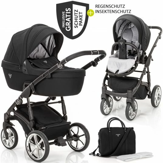 - Extras: inklusive Wickeltasche mit Wickelunterlage, Beindecke für den Sportwagenaufsatz, Schutzdecke für die Wanne, Regenschutz für Wanne und Sportwagensitz, Insektenschutz für Wanne und Sportwagensitz, Becherhalter