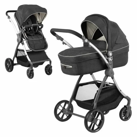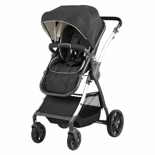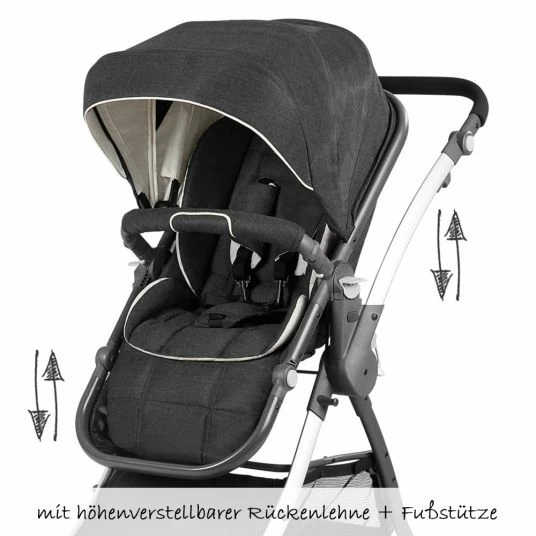 - Equipment:Β swivelling and lockable front end of the curved aluminium frame, portable baby bath with protective blanket, sports car attachment with multiple adjustable backrest, padded foot rest, etc; large hood, XXL shopping basket, removable protective cover, kink slider, sports seat can be attached on both sides, height adjustment for baby bath and sports seat possible, easy-fold mechanism