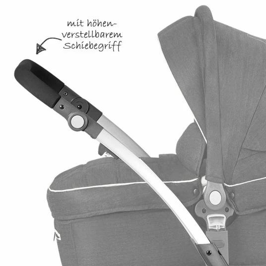 As soon as your child can sit independently, you can quickly and easily replace the bathtub with the stroller attachment with a single click. The attachment can be installed either in or against the direction of travel as required. The removable protection guard and the integrated 5-point harness with belt pads ensure safety. The backrest and foot rest can be adjusted several times. The large hood provides shade. This way, your offspring can keep a nap in between and always arrive at their destination rested.