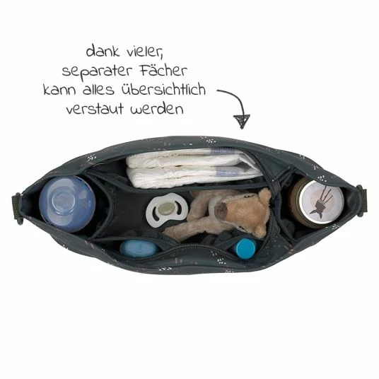 Das große Hauptfach lässt sich sicher mit einem Reißverschluss verschließen. In zwei weiteren Fächern seitlich kannst Du Fläschchen und Gläschen gut verstauen. Der Buggy Organizer wird ganz einfach mittels Karabinern an den Schiebegriffen Deines Kinderwagens oder Buggys befestigt. Der kompakte Kinderwagen Organizer ist auch im Alltag und auf Reisen sehr nützlich.