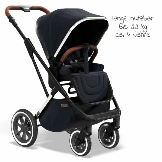 - Ausstattung: umsetzbare Sitzeinheit, weich gepolsterte RĂŒckenlehne bis in Liegeposition verstellbar, gepolsterter mitwachsender 5-Punkt-Gurt, extra groĂes Verdeck mit Klimafenster, UV-Schutz 50+, höhenverstellbarer Knickschieber, groĂe HinterrĂ€der (29 cm), schwenkbare und feststellbare VorderrĂ€der (19,5 cm), Feststellbremse, abnehmbarer und aufklappbarer  SchutzbĂŒgel, groĂer Einkaufskorb