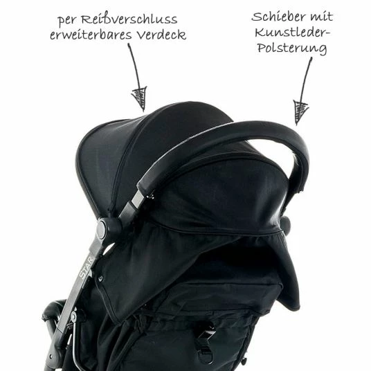 Optimum protection in wind and weather is provided by the buggy’s large hood with a sun protection factor of 50+. It can be extended by a zipper and has a large mesh insert. This way a good air circulation in the star is ensured – especially practical on warm days.