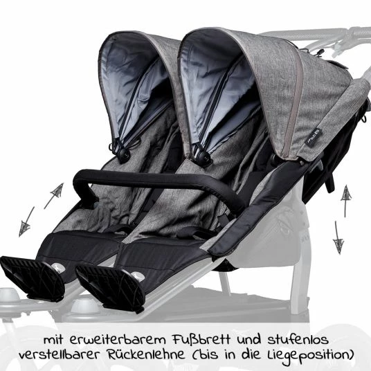 Die XXL-Komfortsitze für den Geschwister- und Zwillingswagen Duo – Premium Grau ermöglichen die Nutzung Deines Kinderwagens Duo über das Kleinkindalter hinaus. Auch Kinder im Kindergartenalter werden bei Wanderungen und längeren Aufenthalten im Freien irgendwann müde. Im Sportsitz können sie sich zwischendurch ausruhen – oder auch einfach mal die Augen zumachen. Die Sitzflächne der Sportsitze sind stufenlos bis in die Liegeposition verstellbar um sie optimal den Bedürfnissen Deiner Kinder anpassen zu können. Hier findet Dein Nachwuchs im Alter von mind. 9 Monaten bis ca. 4 Jahre (Gesamtbelastung von 45 kg) bequem Platz. Zusätzlich sind die Sitze mit erweiterbaren Fußbrettern ausgestattet. So können Deine Kleider in jedem Alter bequem die Füße hochlegen. Sicherheit muss dabei sein: Deshalb ist jede Sitzeinheit nicht nur mit einem Kopfpolster sondern auch mit einem gut gepolstertem 5-Punkt-Gurtsystem ausgestattet. Die beiden Sitzeinheiten teilen sich einen großen, gepolsterten Schutzbügel, der sich für den leichten Ein- und Ausstieg öffnen lässt. Für Schatten im Inneren sorgen zwei große, ausziehbare Verdecke. Wird es Draußen einmal ungemüglich, kommen in die beiden in die Rückseite der Sitze integrierten Regenverdecke zum Einsatz.