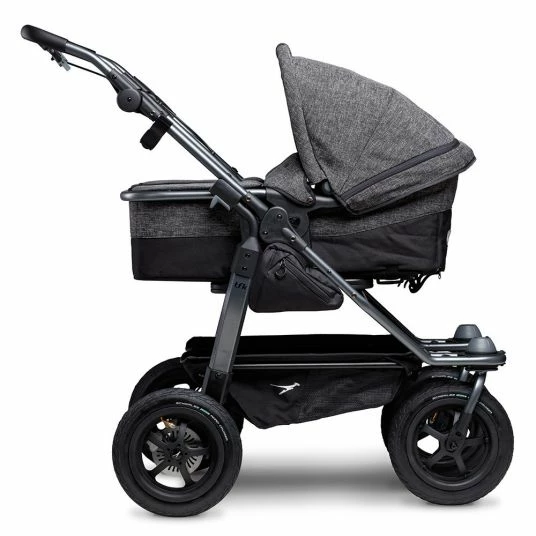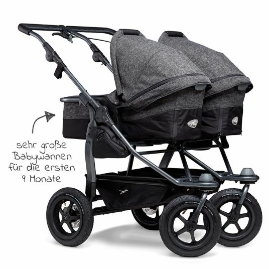 Der Geschwister- und Zwillings-Kombi-Kinderwagen Duo – Premium Anthrazit mit 2 Babywannen, die zu Sportsitzen umbaubar sind, ist die konsequente Weiterentwicklung der bewährten TFK-Klassiker Twin Trail und Twin Adventure. Wie bei seinen Vorgängern werden auch hier Qualität und Sicherheit großgeschrieben.