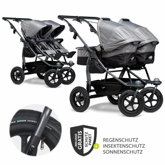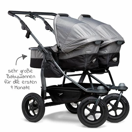 Discount 🔔 TFK Geschwister- & Zwillingskinderwagen Duo mit Luftreifen – 2x Kombi-Einheit (Wanne+Sitz) + XXL Zamboo Zubehör – Grau – Collection 2022 🌟