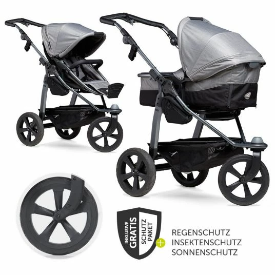 Im Set inklusive ist ein großes XXL-Wetterschutz-Paket, das neben einem Regenschutz für die Babywanne und einem Regenschutz für den Sportsitz auch ein Sonnensegel und ein Insektennetz von Zamboo enthält.