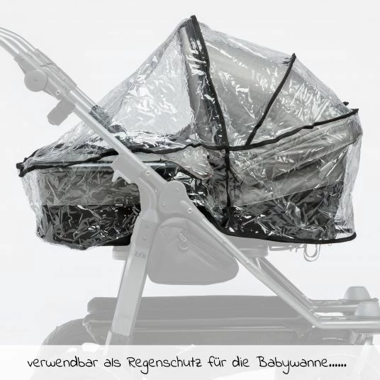 Der Regenschutz sitzt passgenau. Für einen guten Luftaustausch ist dabei stets gesorgt. Du kannst das Verdeck ebenso lange einsetzen, wie Du Deinen Kinderwagen verwendest (36 Monate) – er passt sowohl über die Wanne als auch über den umgebauten Sportsitz. So ist auch der Spaziergang bei schlechem Wetter ein Kinderspiel.