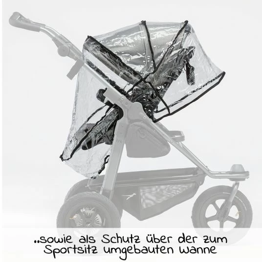 Der Regenschutz sitzt passgenau. Für einen guten Luftaustausch ist dabei stets gesorgt. Du kannst das Regenverdeck ebenso lange einsetzen, wie Du Deinen Kombi-Kinderwagen verwendest (36 Monate) – erst über der Wanne und anschließend über dem umgebauten Sportsitz.