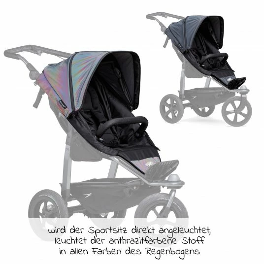 Unter normalem Lichteinfluss wirkt der Stoff anthrazitfarben. Wird der Sportsitz direkt angeleuchtet, beispielsweise von Autoscheinwerfern, leuchtet er in allen Farben des Regenbogens. Das sieht nicht nur toll aus, sondern bietet bei schlechten Lichtverhältnissen mehr Sicherheit