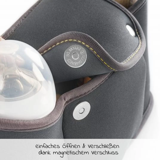 Praktisch: Durch die hochwertigen Magnetknöpfe bleibt die Tasche auch bei Wind zu. Außerdem ist es einfacher zu öffnen und schließen als ein Reißverschluss. Die Außenfächer sind nach oben offen und eignen sich prima für Babyfläschchen oder Deinen Kaffeebecher. So hast Du Getränke stets vor Dir und musst nicht mühsam im Kinderwagenkorb suchen.