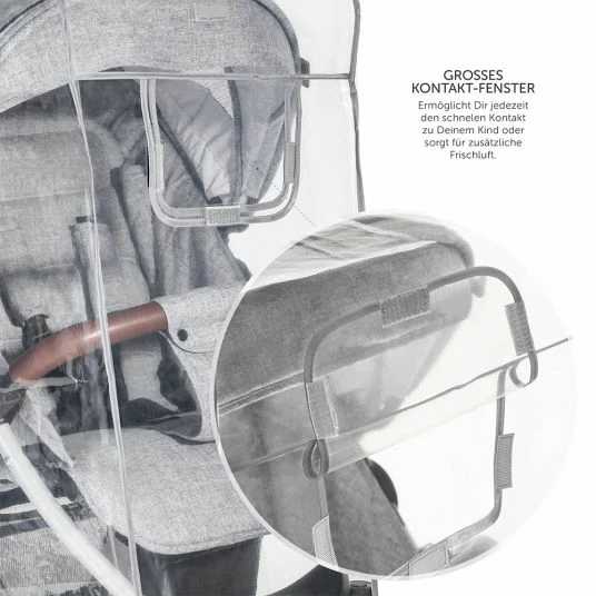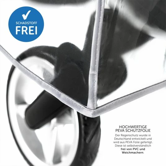 Für eine optimale Luftzirkulation verfügt der Regenschutz über eine kürzere Rückseite. Dadurch kommt die Luft von unten ins Innere. Die Folie beschlägt nicht und Dein Kind bleibt zu 100% trocken – anders als bei Planen mit Lüftungslöchern. Durch die transparente Folie kann es seine Umwelt betrachten und auch Du hast freie Sicht auf Dein Baby. Die reißfeste Folie entspricht der Norm EN 71 und enthält keine gesundheitsgefährdenden Weichmacher.